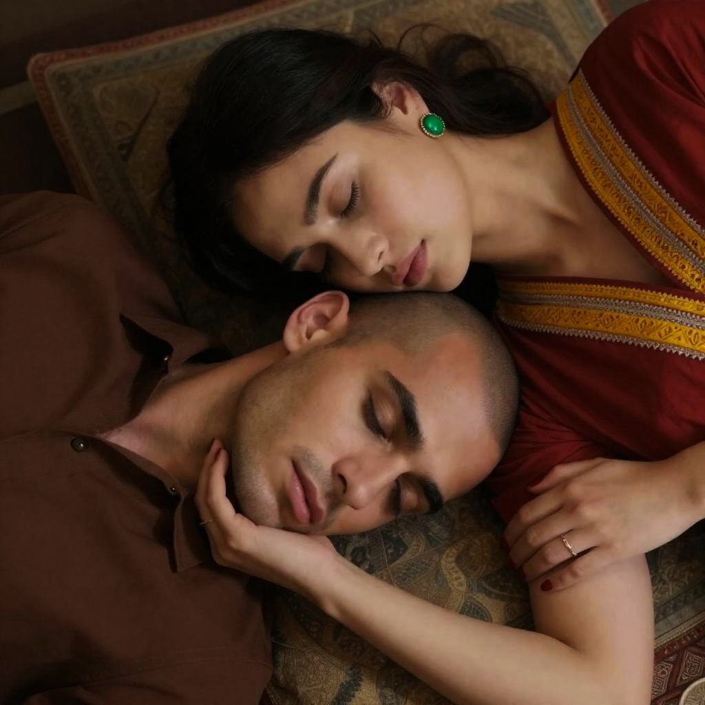 Photograph of a bald man and a woman with dark hair, lying closely together. The man's head rests on her shoulder, eyes closed. The woman's eyes are closed, wearing a red and yellow embroidered dress, green earrings, red nails, and rings. Both wear brown clothing. She rests her hand on his forehead. Patterned pillow under her head. Intimate, peaceful pose.