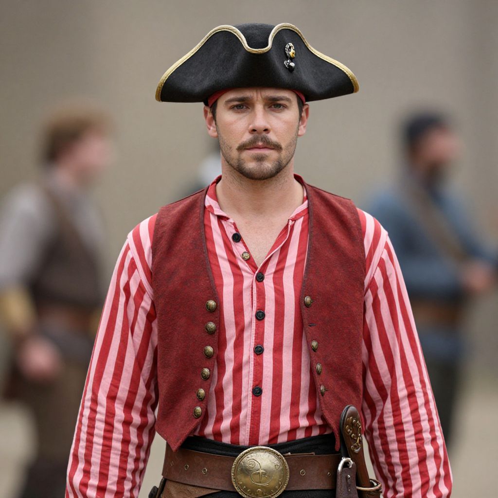 Captain pike costume, 1boy, male focus, solo, belt, shirt, blurry background, striped shirt, hat, blurry, red shirt, looking at viewer, bicorne, buttons, pirate hat, pirate, upper body, outdoors, belt buckle, brown belt, striped clothes, vest, closed mouth, buckle, facial hair, realistic, mustache, vertical-striped shirt, collared shirt
