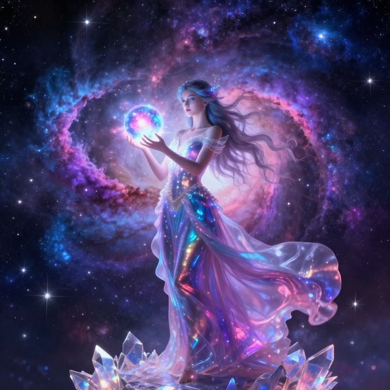 Digital artwork of a mystical, ethereal woman with glowing blue aura, flowing white dress, and outstretched arms, surrounded by cosmic symbols and stars