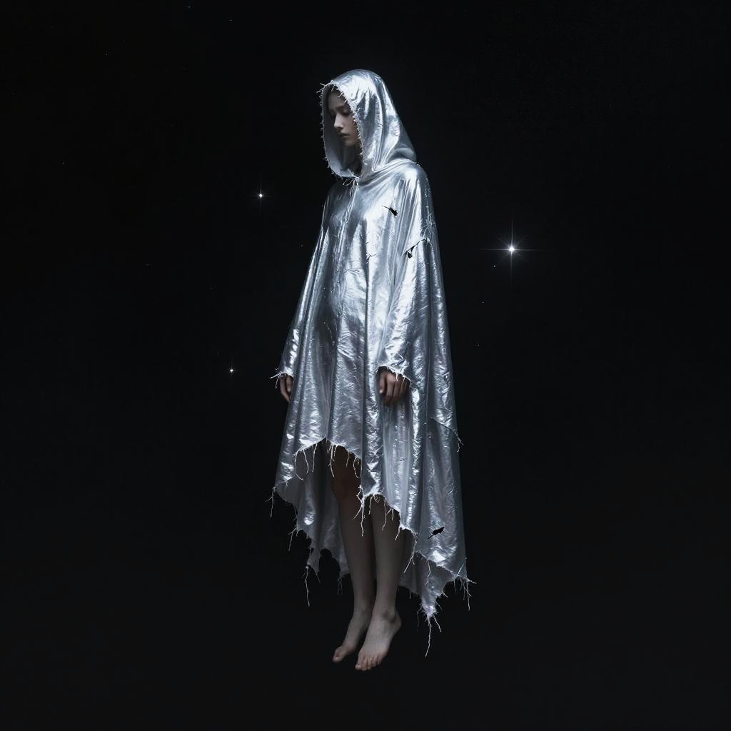 Dreamer from the silver void, melancholy drapes every star, in minimalist cosmic art style, floating suspended in endless dark, with tattered cloak illuminated by starlight, stillness broken by gentle sparkles