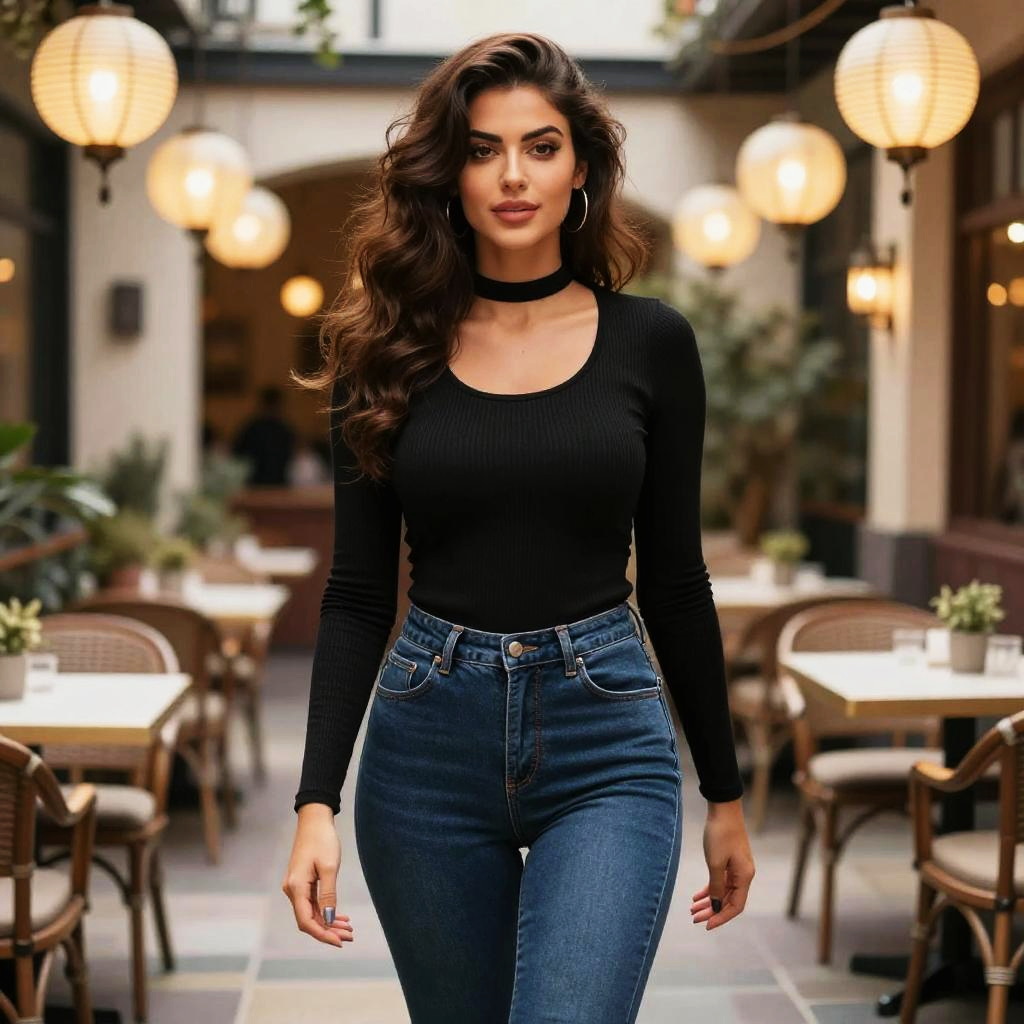 A lean woman in a contemporary off-the-shoulder white top and black high-waisted skinny jeans, standing at a tapas lounge in a rooftop garden, captured in a vibrant and lively visual style. Sexy. Pretty face and beutiful eyes