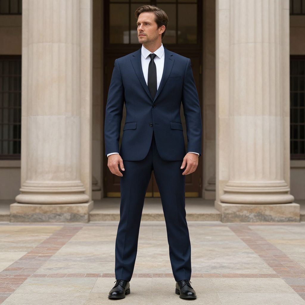 Photograph of a tall, Caucasian man with short brown hair, standing confidently in front of an elegant building with tall, beige stone columns. He is wearing a dark navy blue, single-breasted suit with a white dress shirt and a black tie. His black leather dress shoes are polished. The background includes a stone-paved courtyard with a pattern of light and dark tiles. The man's posture is straight and assertive, with his hands relaxed at his sides. The lighting is natural, highlighting the textures of his suit and the stone columns.