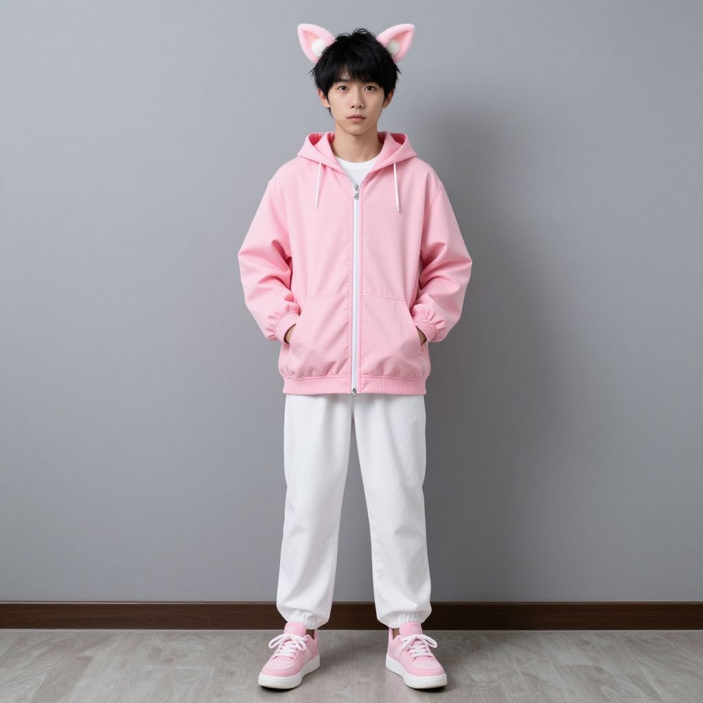 Pink sweeties costume, solo, 1boy, male focus, realistic, shoes, full body, sneakers, jacket, hood, standing, looking at viewer, pink footwear, hands in pockets, fake animal ears, pants, black hair, pink jacket, animal ears, white pants