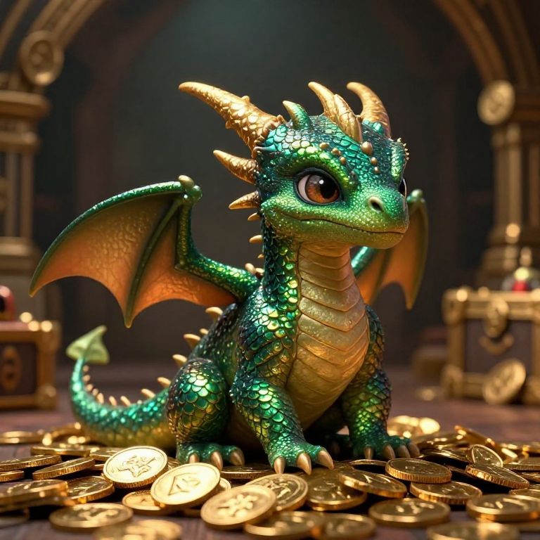 Baby dragon art illustrating a mischievous baby dragon with shimmering emerald scales sitting atop a pile of gold coins in a dimly lit treasure chamber, with dramatic lighting and rich textures emphasizing the fantasy theme.