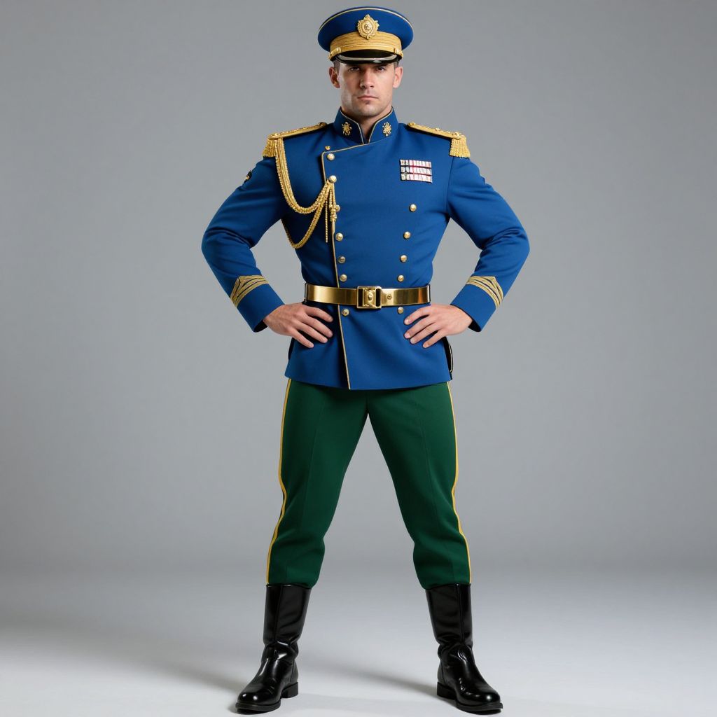 A commanding, muscular man in his late 30s, with short, neatly trimmed dark hair and a serious, resolute expression, is standing with his hands firmly on his hips. He is wearing a detailed military uniform featuring a striking blue and green color scheme with prominent gold accents, including a distinctive blue hat adorned with a gold emblem on the top and a gleaming gold belt. He is wearing polished black boots.