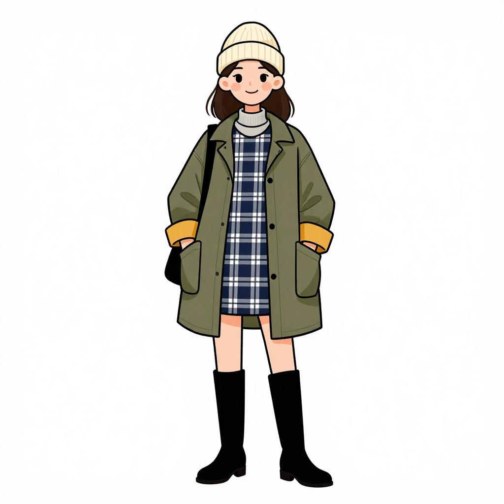 Woman with pretty face and pretty hair. smiling Woman, preppy chic, plaid wool coat in navy and burgundy, structured silhouette, collar, button-down front, side pockets, mid-thigh length, denim shirt underneath with the collar visible, layered with a blue crewneck sweater, sheer black tights with polka dot pattern, mustard yellow suede loafers, white studio background. --sref 1467