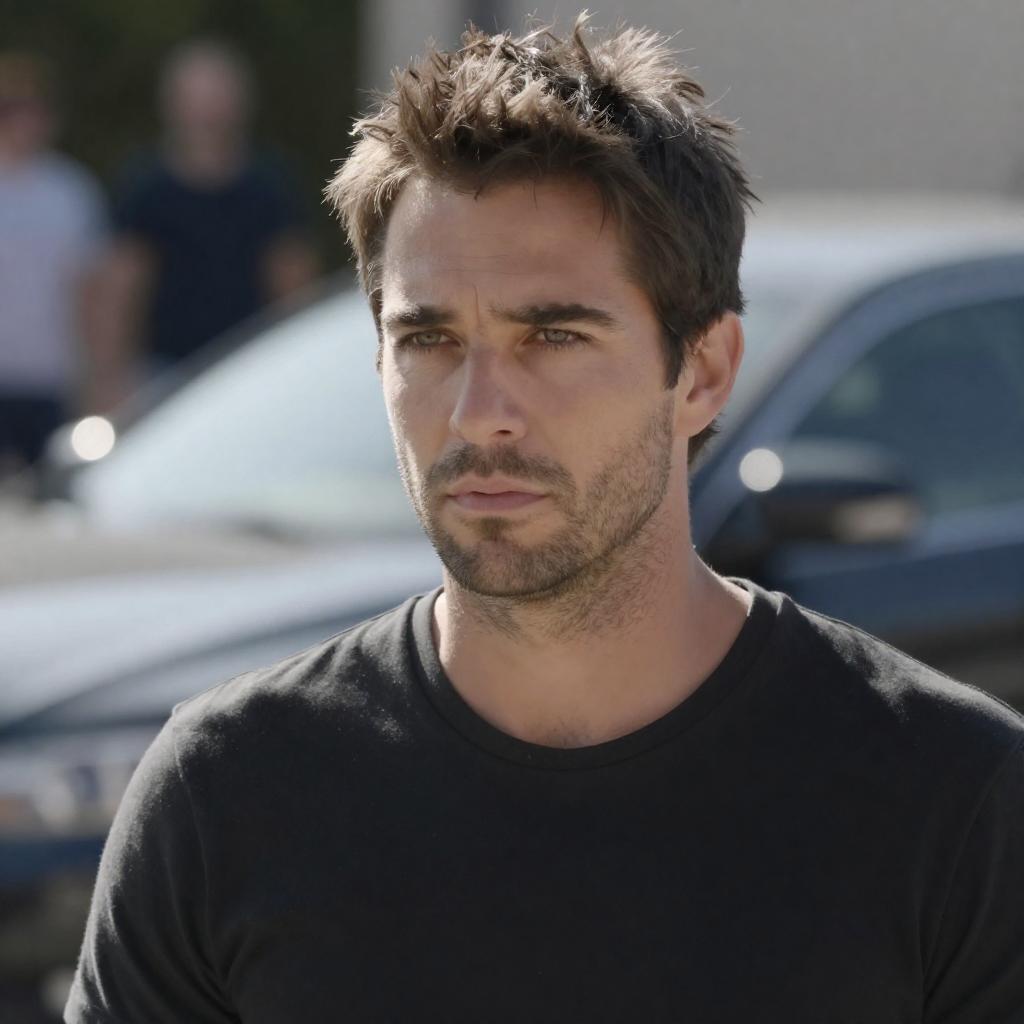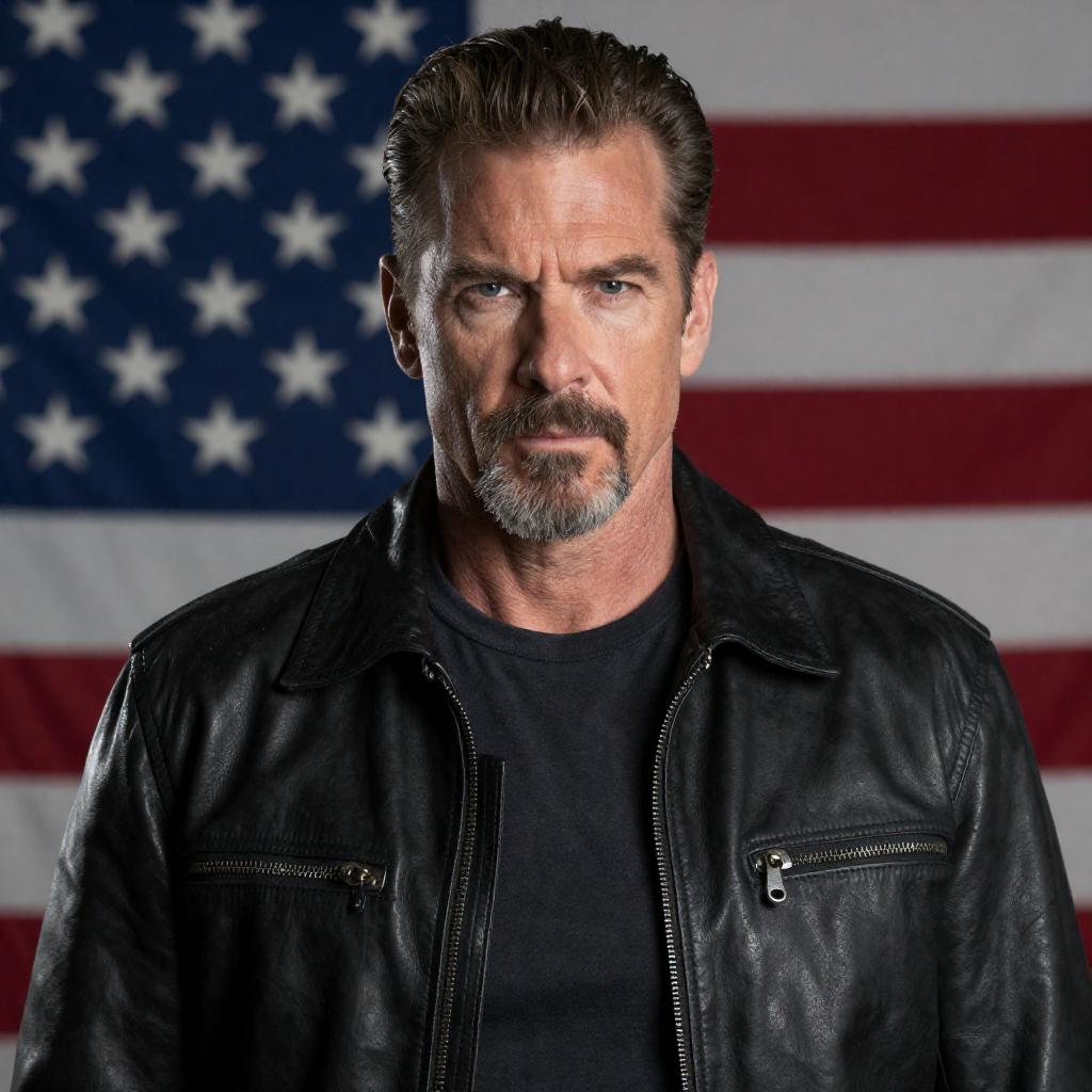 Photograph of a serious-looking man with short dark hair, wearing a black shirt and brown leather jacket, standing against a backdrop of a wavy American flag with stars and a sunset. Buildings in the distance. Upper body focus.