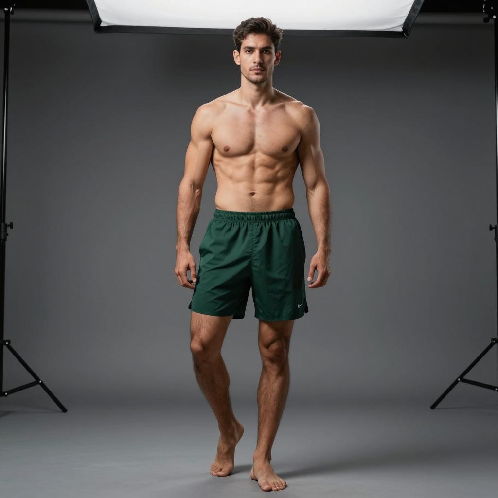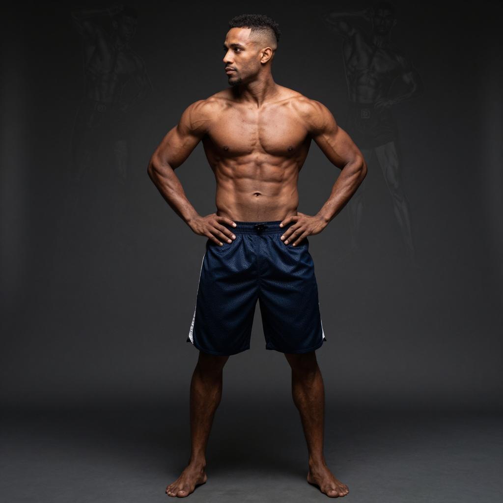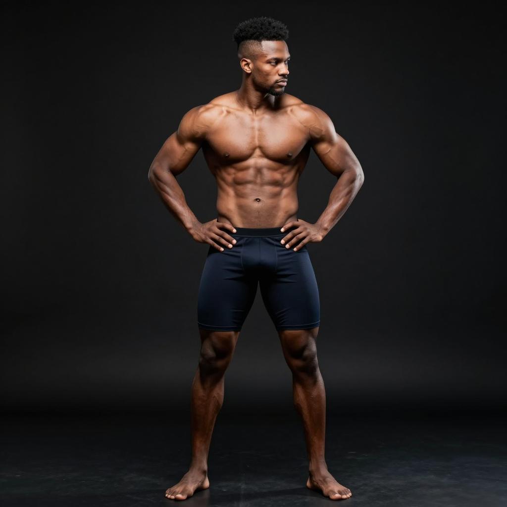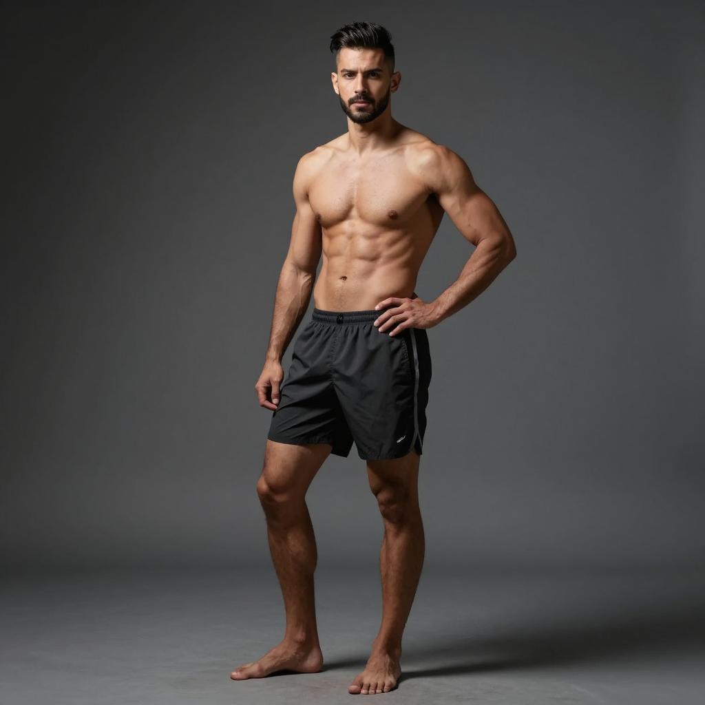 Full body portrait of fit man with sixpack abs, Eastern European-looking man with strong brow and clean shave wearing maroon workout shorts with minimal branding posed standing with feet shoulder-width apart and hands on hips, torso turned slightly to the side in dark gradient studio backdrop fading to black under back rim light with subtle front fill for a heroic silhouette, ultra-detailed fitness photography, 8k, sharp focus