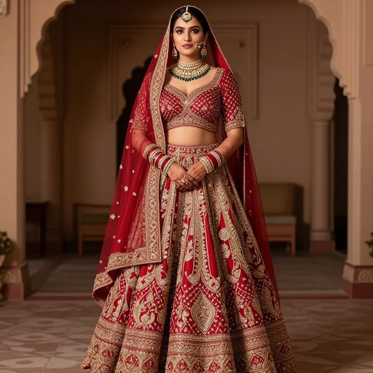 Photograph of an Indian bride in a red and gold embroidered lehenga and dupatta, wearing traditional jewelry, standing in an ornate, arched