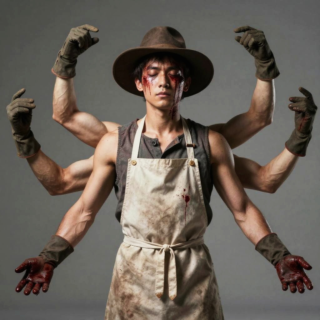 Best quality, masterpiece, ultra high res, (photorealistic:1.4) extra arms, closed eyes, hat, apron, gloves, buttons, and blood on face