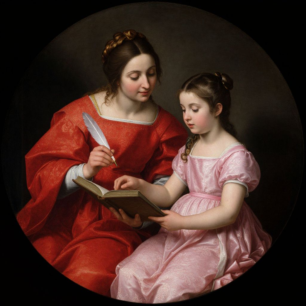 This is a digital painting in a classical style depicting a woman and a young girl. The woman, with fair skin and dark brown hair in a bun, wears a red, ornate dress with white cuffs and holds a knife in her right hand while pointing to a book with her left. She has a gentle expression. The young girl, also with fair skin and dark brown hair in a bun, wears a pink, floral-patterned dress with puffed sleeves. She looks down at the book with a focused expression. The background is dark, making the subjects and their clothing stand out. The image is circular, with a black border.