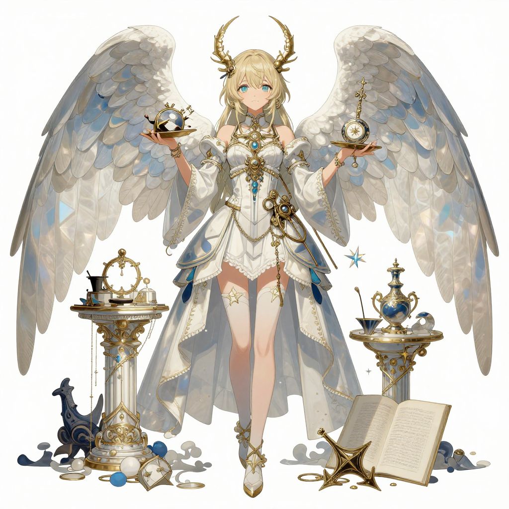 Harmony an anime angel with wings holding things, in the style of prismatic portraits, celestialpunk, elaborate costumes, loose and fluid, lyco art, nabis, meticulous design,