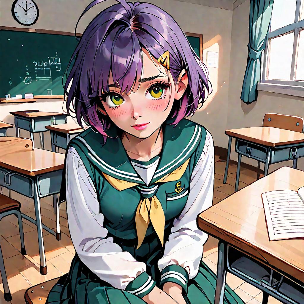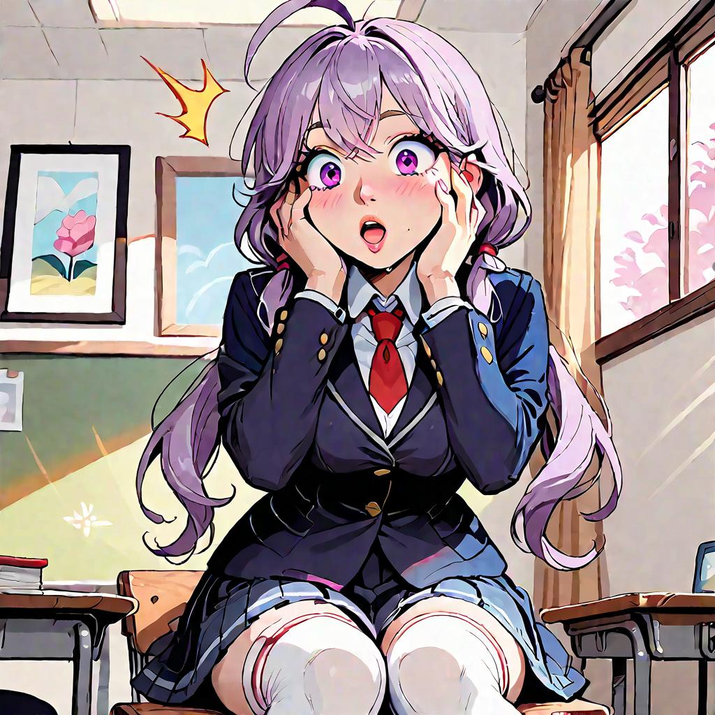 Score_9, score_8_up, score_7_up, score_6_up, score_5_up, score_4_up, source_anime, masterpiece, anime screencap, anime_lineart anime coloring, long hair, purple eyes, twintails, low twintails, ahoge, large breasts, indoors, school uniform, blazer, necktie, white thighhighs, pleated skirt, open jacket, surprised, open mouth, hands on own face