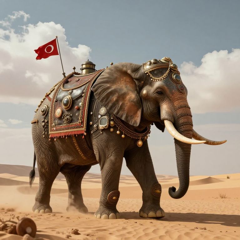 Photograph of a majestic elephant adorned with elaborate, ornate black and gold harnesses, featuring circular and decorative metal embellishments. The elephant has large, white tusks and a black, textured hide. A red Turkish flag with a white crescent and star flies from its back. The background showcases a bright, clear blue sky with fluffy white clouds and a sandy desert landscape with gentle dunes. The elephant's regal appearance contrasts with the arid, sunlit surroundings.