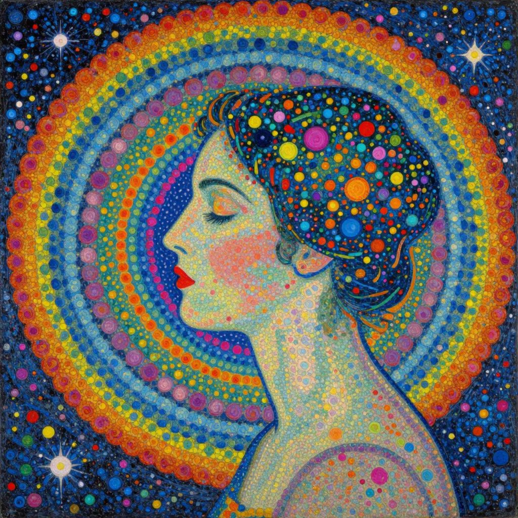Pointillist portrait featuring a serene profile of a woman with closed eyes, surrounded by vibrant concentric circles and a cosmic array of colorful dots, evoking the essence of early modernity's dotted art style.