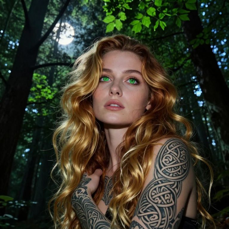 A hyperrealistic portrait captures an enigmatic figure with captivating green eyes and intricate Celtic tattoos adorning their arms. Bathed in soft moonlight filtering through a dense forest canopy, the unique low-angle perspective emphasizes their ethereal emerald irises, seemingly holding ancient secrets. Their hair, a rich gold and auburn blend, cascades naturally over their shoulders, strands illuminated by the lunar glow. This serene expression hints at untold stories. The surrounding environment is rendered in hyperrealistic detail, with majestic trees featuring shimmering emerald leaves that contribute to the mystical atmosphere, perfectly complementing the subject's enigmatic aura.