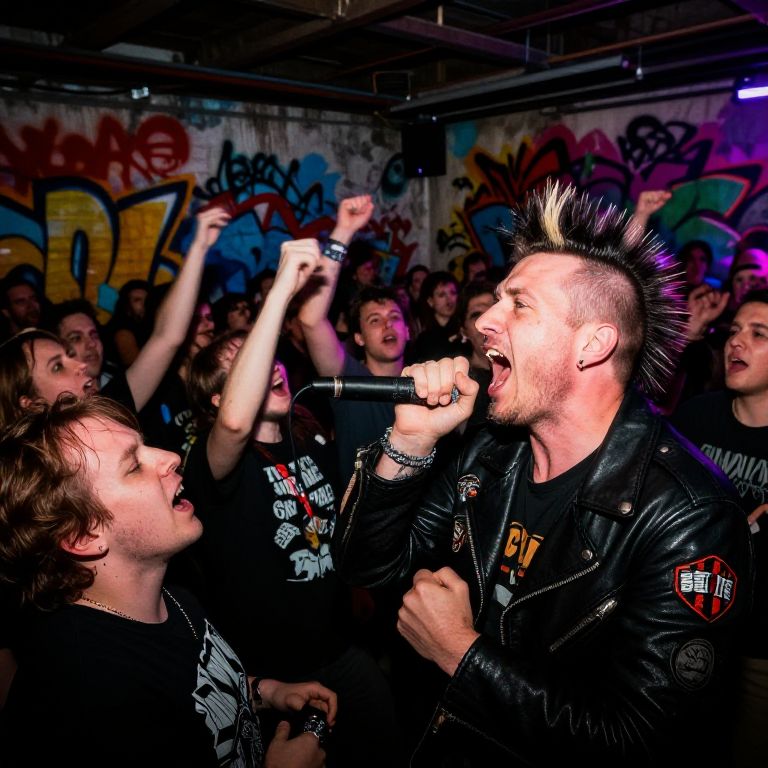 A group of moshers jumping in sync in front of a massive stage during a live hardcore show, explosions of colored powder, vibrant stage lights, gritty concrete walls covered in band posters, dynamic compositions capturing chaos and thrill of punk culture.