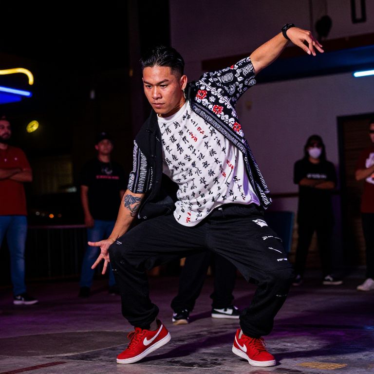 Photograph of six male performers in black shirts leaping on stage with colorful lights, surrounded by a crowd, framed by graffiti posters.