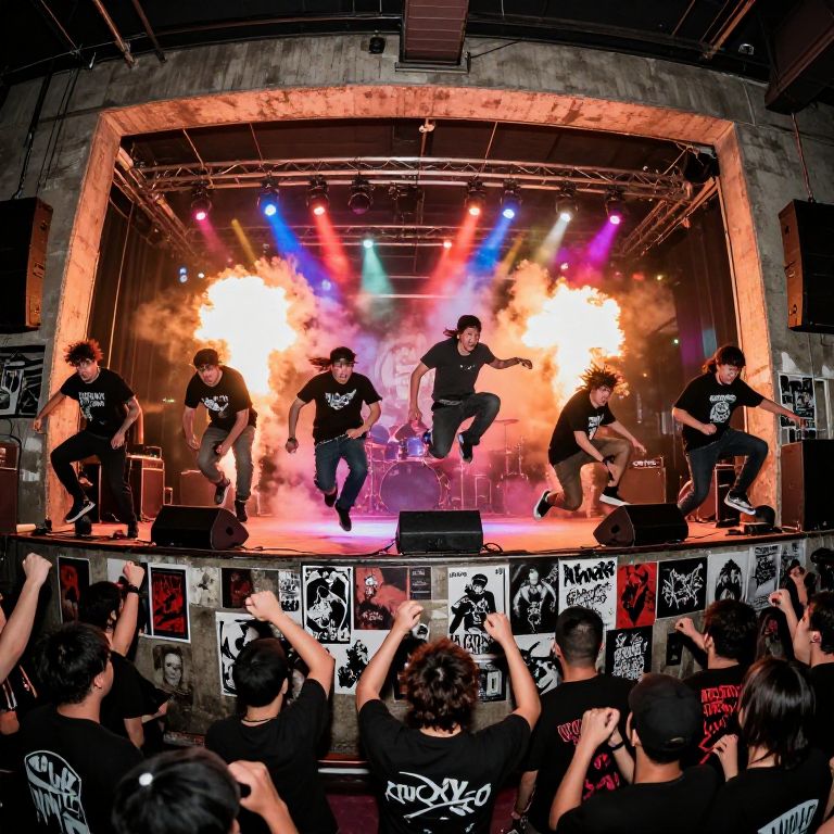 Photograph of a dynamic live concert performance on a small stage. Six male musicians, wearing black T-shirts with white graphic designs, leap energetically across the stage. Bright, colorful stage lights in red, blue, and white illuminate the performers, creating vivid, dramatic shadows. The background reveals a concrete wall with graffiti posters lining the lower edge. An enthusiastic crowd in the foreground, also dressed in black with similar graphic T-shirts, raises their hands in excitement. The stage is framed by metal trusses and a low, concrete arch. The overall atmosphere is energetic and intense, capturing the raw, rebellious spirit of the performance.