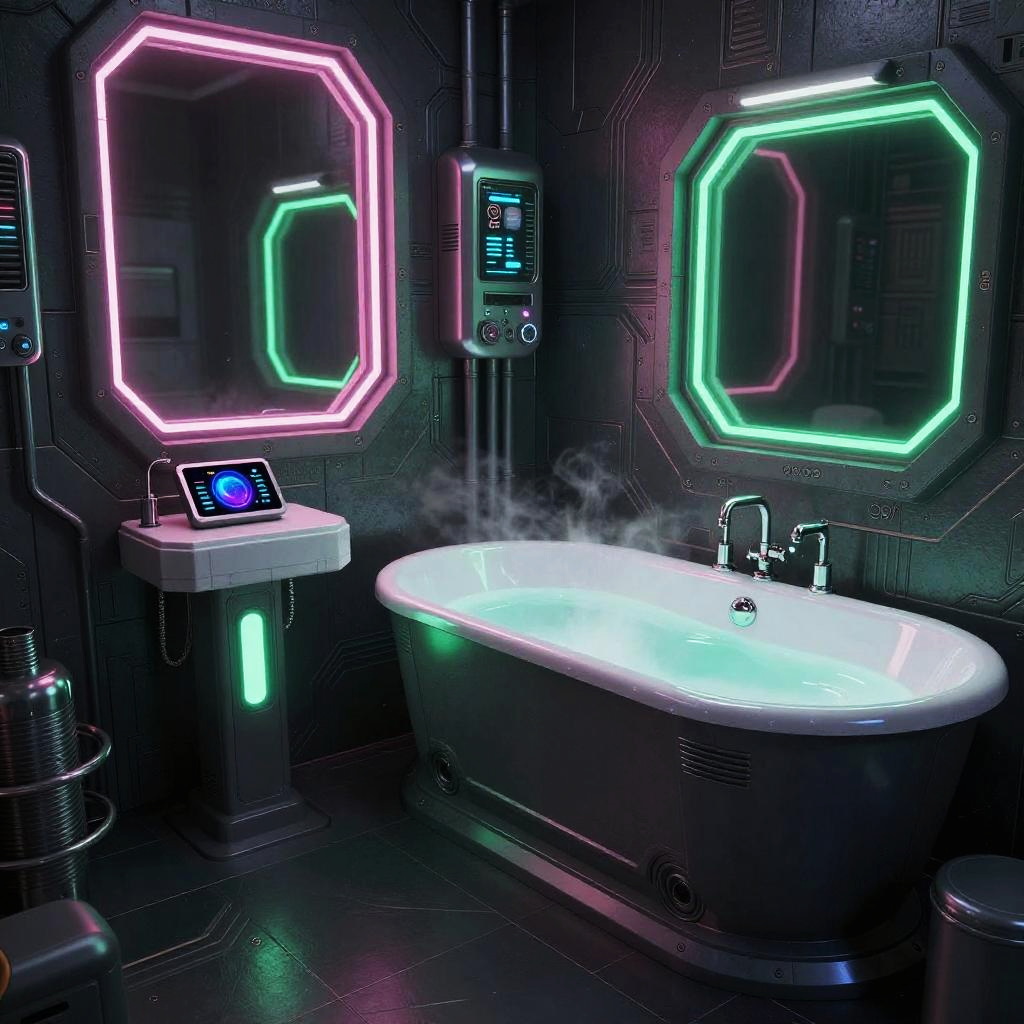Sci fi bathroom in cybernetic theme, dark metallic textures, neon pink and green accents, touch screen faucets, synthetic materials, and a glowing bathtub emitting mist, realistic lighting