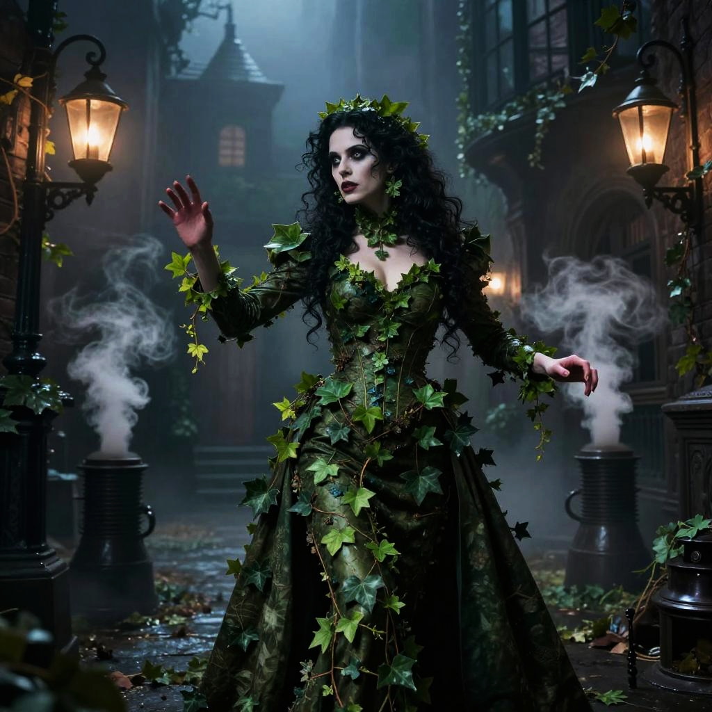 A Poison Ivy reimagined as a Victorian alchemist and botanical occultist from the Batman universe, set in a gaslit, fog-choked Victorian Gotham overrun by animated ivy and steam vents. Directed by a period horror maestro, the scene captures intense action with dramatic lighting, creating a cinematic atmosphere filled with deep shadows.