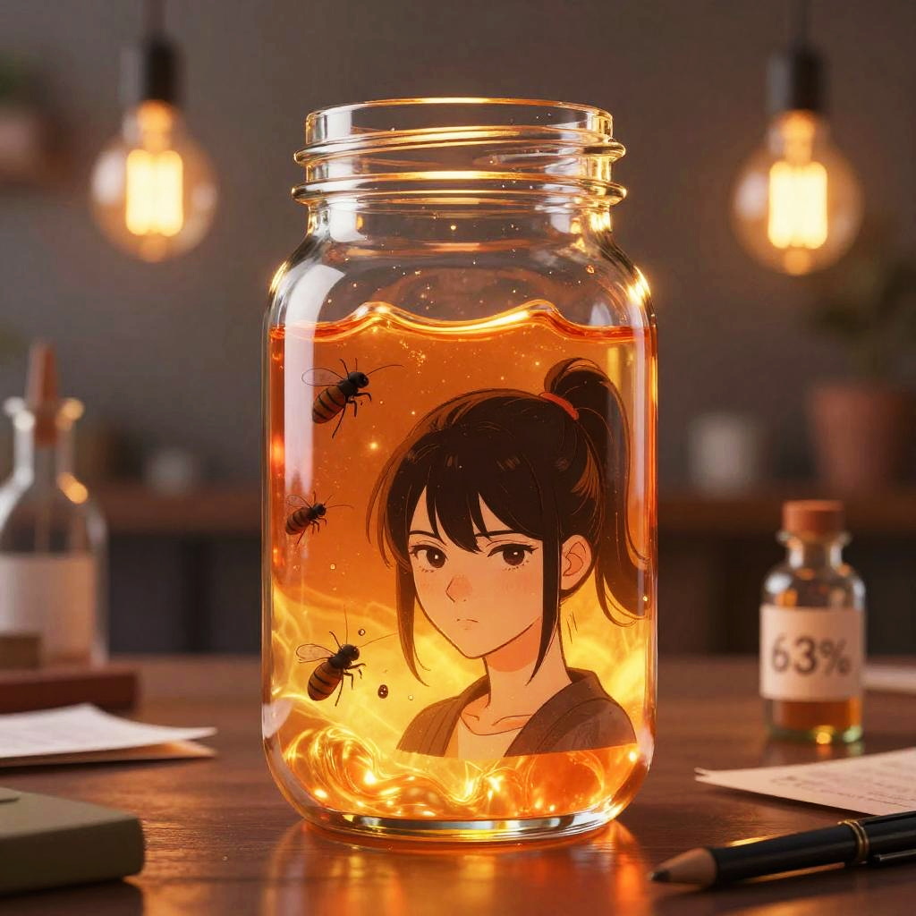 This digital art shows a stylized, anime-inspired scene with a glass jar filled with glowing orange liquid and floating insects. In front of the jar is a glass with a drawn portrait of a serious-looking young woman with dark hair in a ponytail. The background is blurred with warm, hanging light bulbs. A small bottle labeled "63%" is on the right. The table is cluttered with papers and a pen.