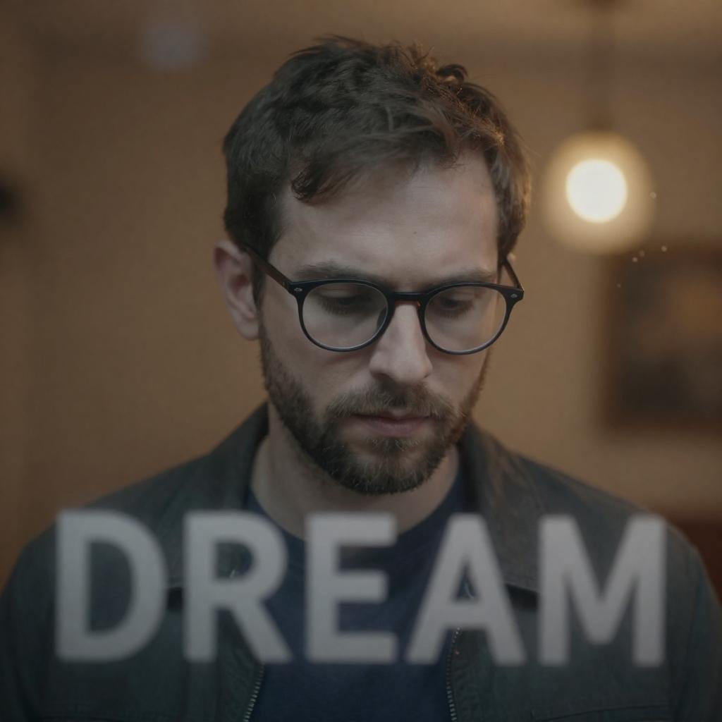 Photograph of a man with glasses, short brown hair, and a slight beard, looking downward through a rain-speckled window. The word "DREAM" is fogged on the glass below. Dim, warm light in the background.