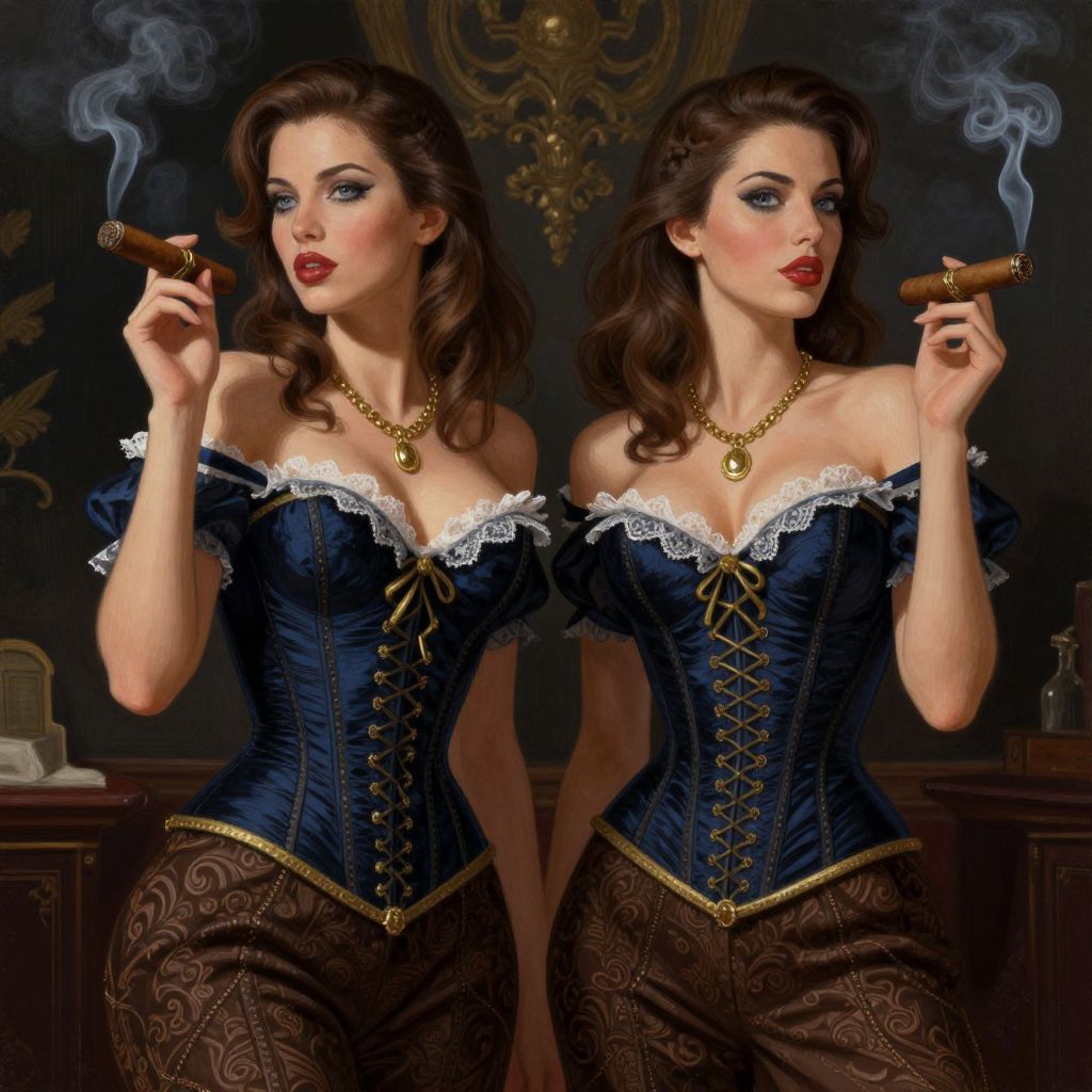 This digital painting features two fair-skinned, brown-haired women with blue eyes, standing side by side, smoking cigars. They're dressed in elaborate, dark blue, off-shoulder corsets with white lace trim and brown patterned pants. Both wear gold necklaces and have confident expressions. The background is dark and ornate, with subtle hints of classical decor. The smoke from their cigars curls upwards, adding a dynamic element to the image.