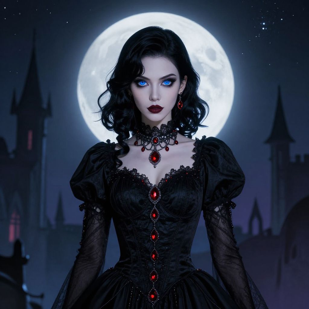 A striking digital illustration of a woman with vivid blue eyes and dark hair styled in soft waves, dressed in a gothic black dress adorned with red gemstone jewelry. She stands confidently under a glowing full moon with a backdrop of pointed, castle-like structures silhouetted against a starry night sky, evoking a gothic fantasy atmosphere.