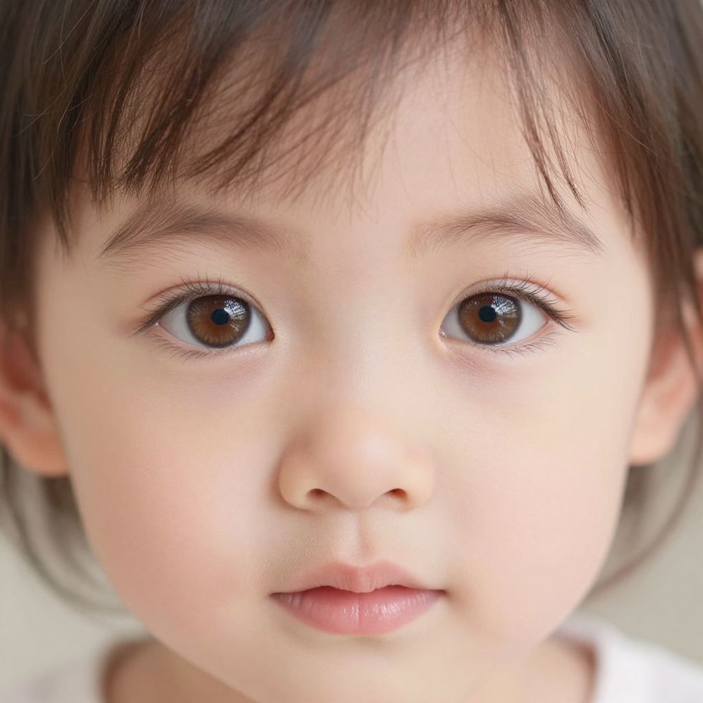 A close-up photograph of an Asian toddler with fair skin and large, dark brown eyes. The child has straight, dark brown hair with bangs slightly covering the forehead. The lips are slightly parted, showing a hint of a smile. The background is blurred and light-colored, keeping the focus on the child's face. The texture of the skin is smooth, and the lighting is soft, highlighting the innocence and curiosity in the child's expression. The photograph captures the delicate features and gentle expression of the young child.