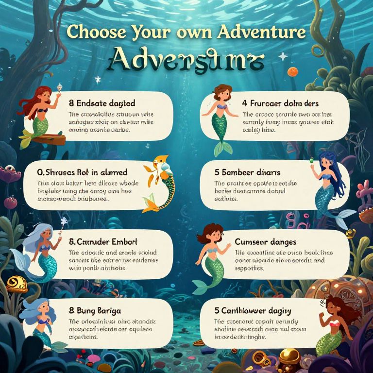 Choose your own adventure prompts capturing an enchanted underwater kingdom with mermaids, sunken treasure, and unseen dangers, encouraging imaginative choices and storytelling in a whimsical and richly detailed fantasy illustration.