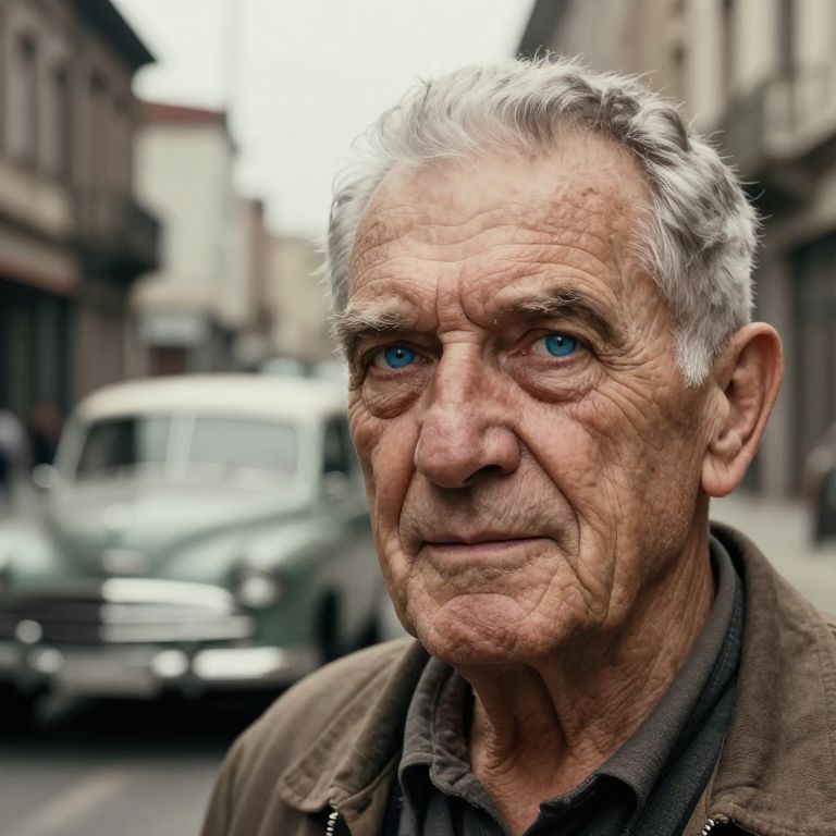 Visualize a smartphone portrait capturing an elderly man's distinctive features: a robust jawline, piercing blue eyes, and graying hair neatly styled in a short cut. His weathered skin bears deep creases around the eyes and mouth, a testament to his life experiences. The intensity of his gaze seems to penetrate through the semi-transparent old cityscape behind him, where vintage cars and buildings merge seamlessly with his striking visage. This double exposure portrait evokes nostalgia and resilience, as if he bridges the gap between past and present, inviting viewers on a reflective journey through time.