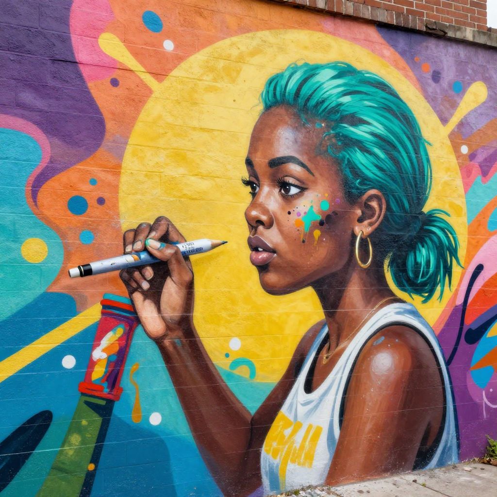 Teal hair black girl painting a large colorful mural on a brick wall, teal hair tied back with paint splatters on face and clothes, expressive artist in action, urban art style, bright and bold colors around, creative atmosphere, detailed and vibrant scene