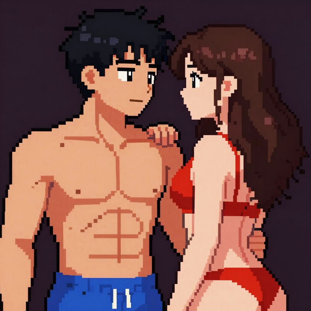 Pixel art nsfw, stylized pixel characters in an intimate moment, bold color contrasts, nuanced pixel shading, high detail 2D retro visual style, vintage RPG game vibe with a sensual twist