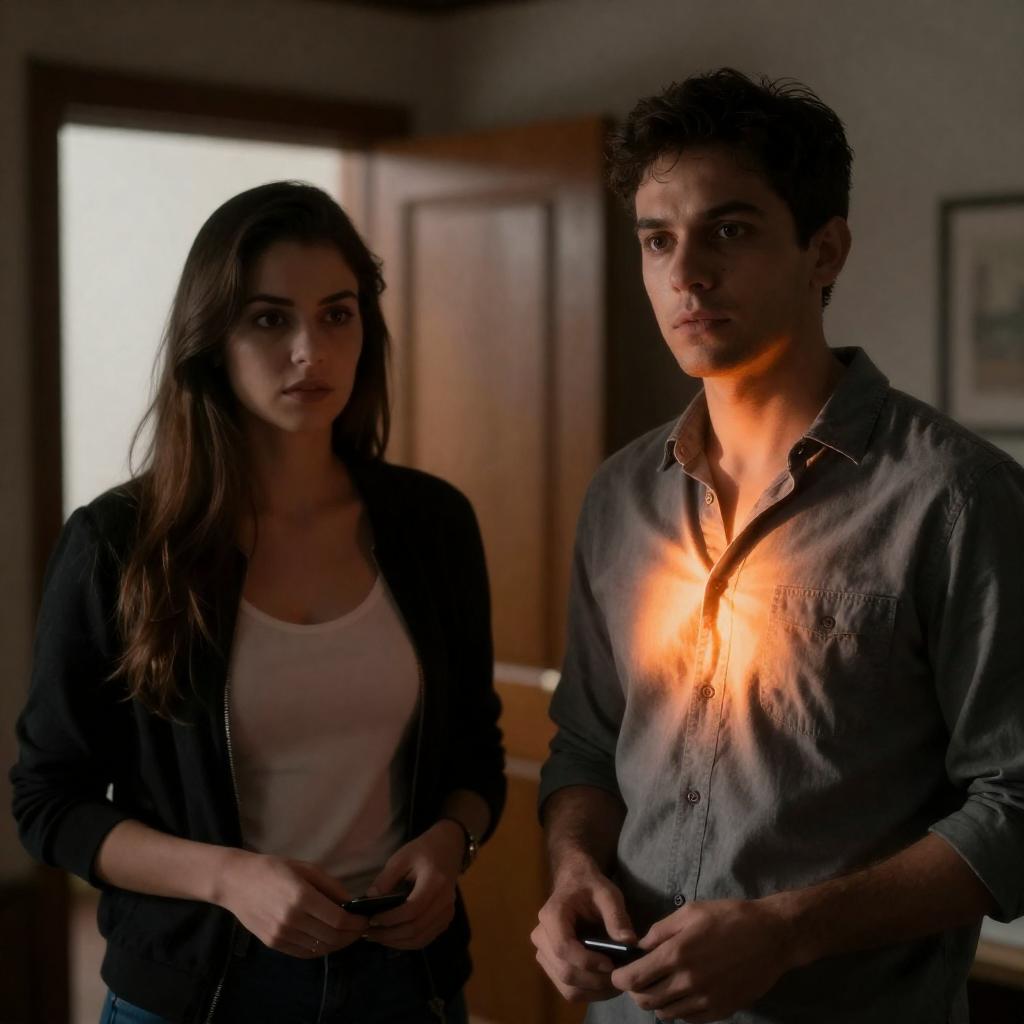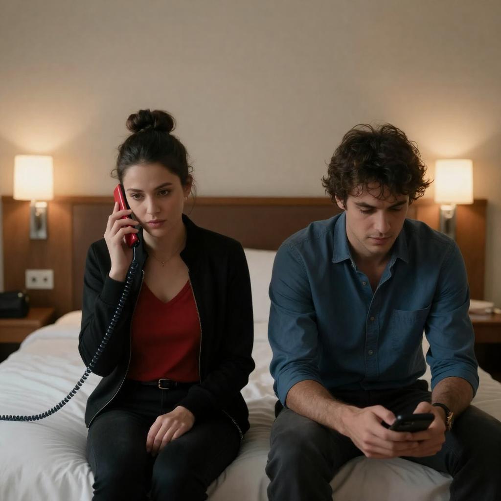 Photograph of a man and woman in a dimly lit hotel room. The woman with dark hair in a bun, wearing a red top and black jacket, holds a red phone to her ear. The man with dark, slightly messy hair, wearing a blue shirt, holds a black phone. They sit on a bed with a wooden headboard and two wall-mounted lights in the background.