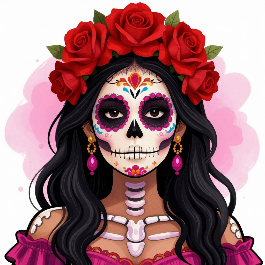 A vibrant digital illustration featuring a Day of the Dead skeleton woman adorned with intricate sugar skull makeup, red roses, and floral accents, rendered in a bold, high-definition style by Allinkdup.