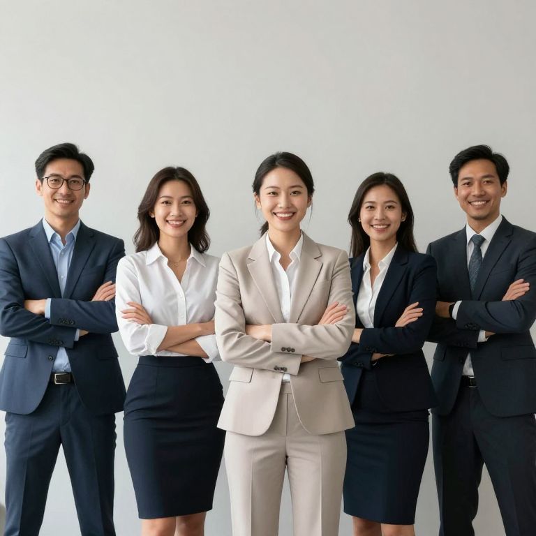 Photograph of five Asian professionals standing in a row, smiling, with arms crossed, wearing formal suits and blouses, against a white background.