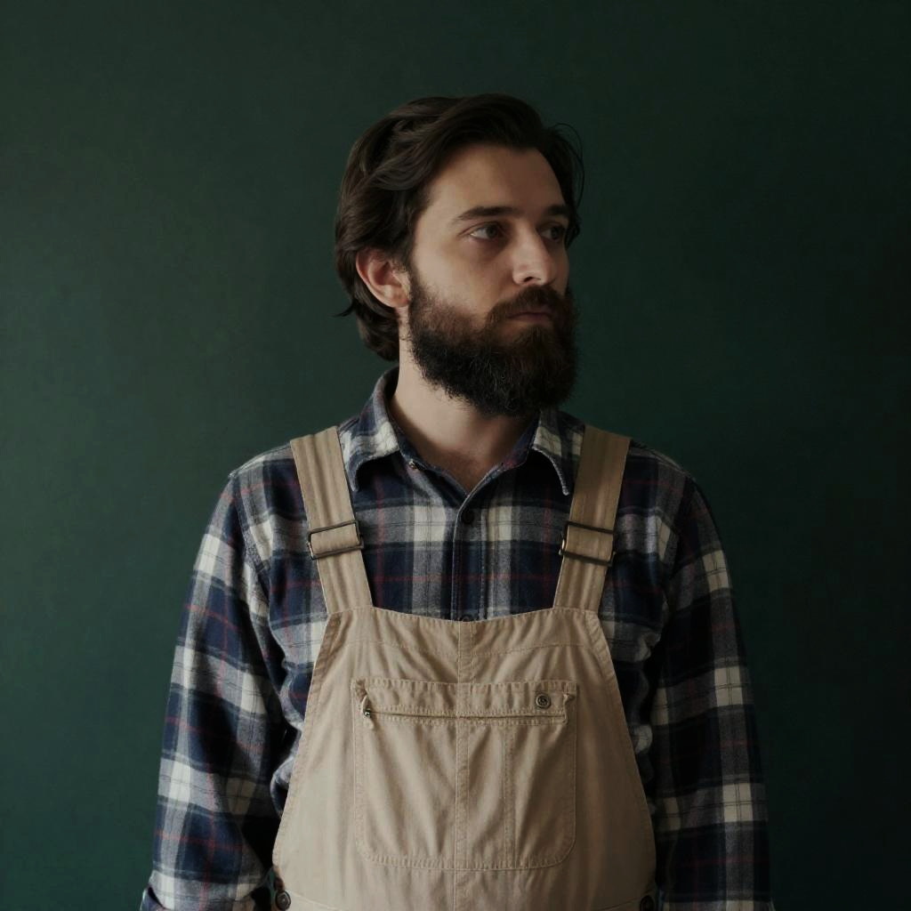 Photograph of a bearded man with long brown hair seated on a wooden chair against a rough light-colored brick wall. He wears a dark gray sweater, brown suspenders, green pants, and black boots. A wooden rifle leans against the wall next to him. The wooden floor with visible planks adds a rustic setting. The man has a neutral expression with his right hand resting on his knee.