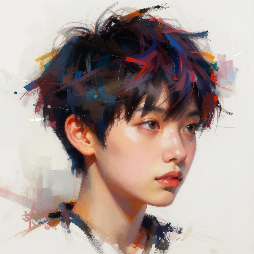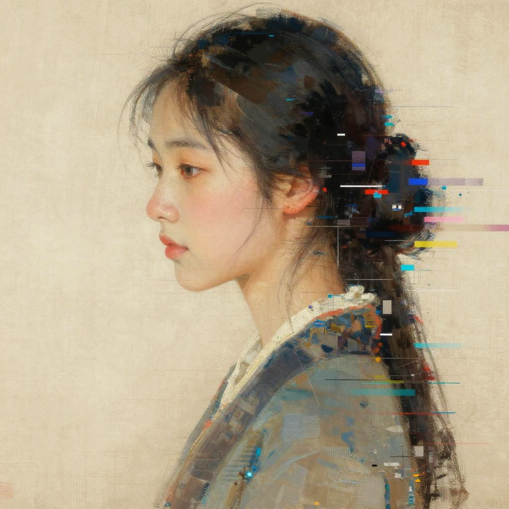 A digital artwork featuring a profile portrait of an Asian young woman with dark hair styled in a loose bun. The image combines soft, traditional painting brush strokes with modern digital glitch effects and pixelated distortions. The background is a light beige color, emphasizing the fusion of classic and contemporary artistic techniques.