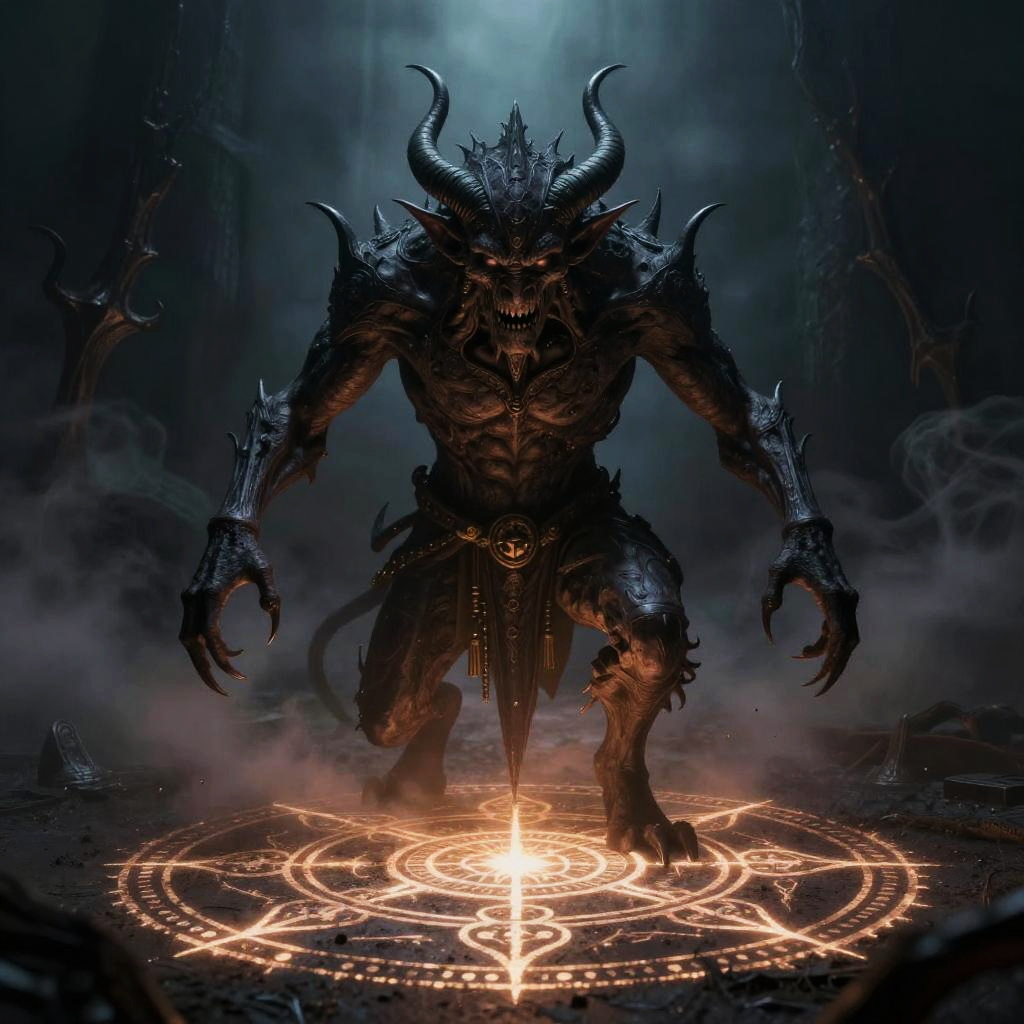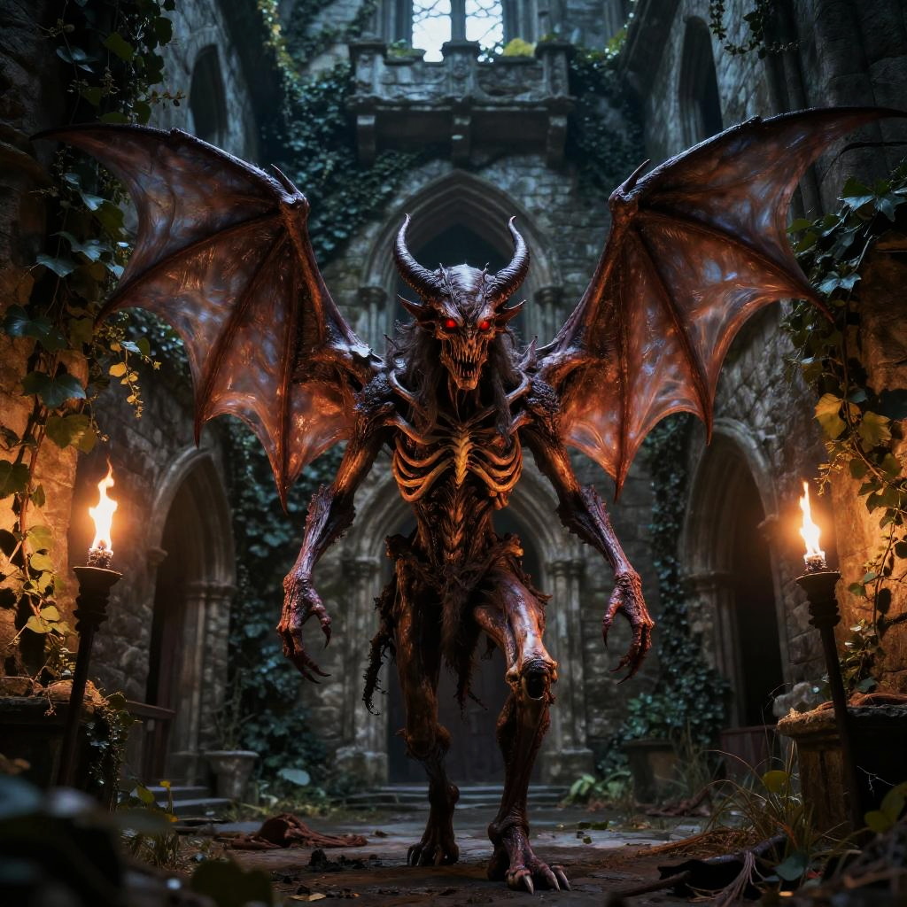 A highly detailed, realistic demon with large demonic wings and glowing red eyes stands menacingly in an abandoned medieval castle. The decayed stone walls are covered in dark ivy, and flickering torchlight casts dramatic shadows across the scene. The demon features lifelike textures of rough skin and exposed bones, creating an eerie and atmospheric fantasy setting.
