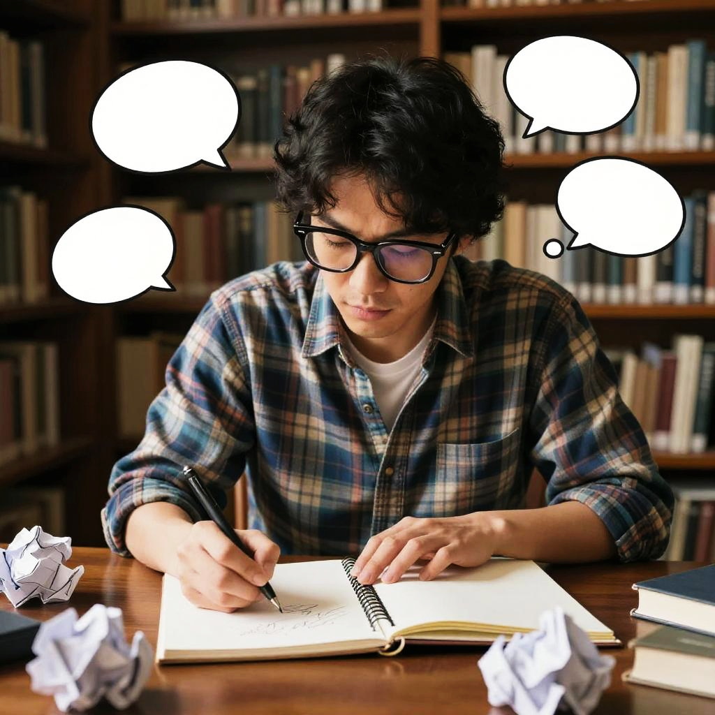 Realistic photo.a passionate writer, wearing oversized glasses and a plaid shirt, drawing on a blank sketchpad, surrounded by crumpled papers and floating thought bubbles, in a dimly lit library, depicted in the refined and narrative-driven style of Takeshi Obata. realistic photo
