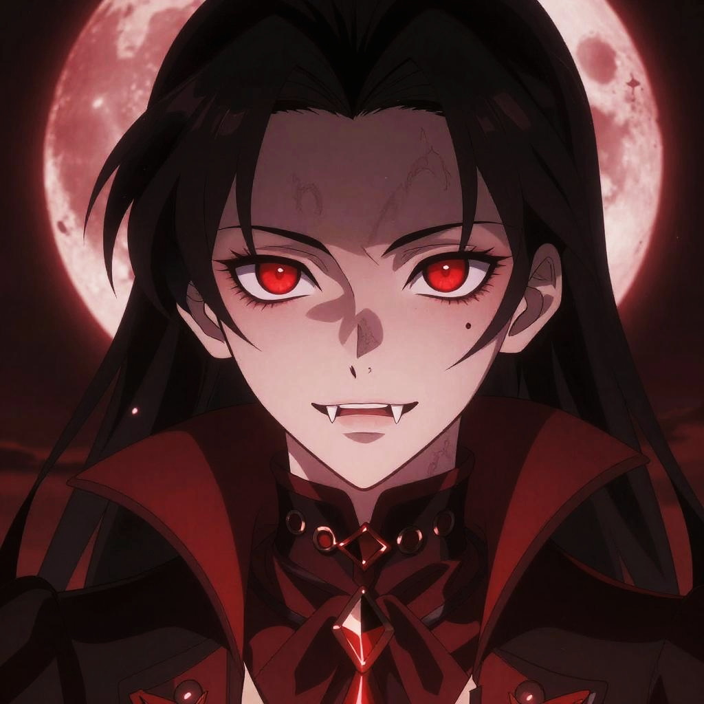 Close-up of a red eye vampire anime girl with sharp fangs and pale skin, wearing a Victorian-inspired dark red and black outfit, intense gaze piercing through shadows, styled with intricate line art and glowing effects, set against a blood-red moon background.