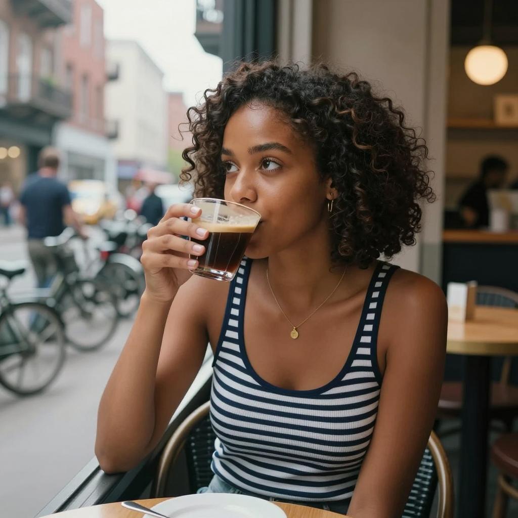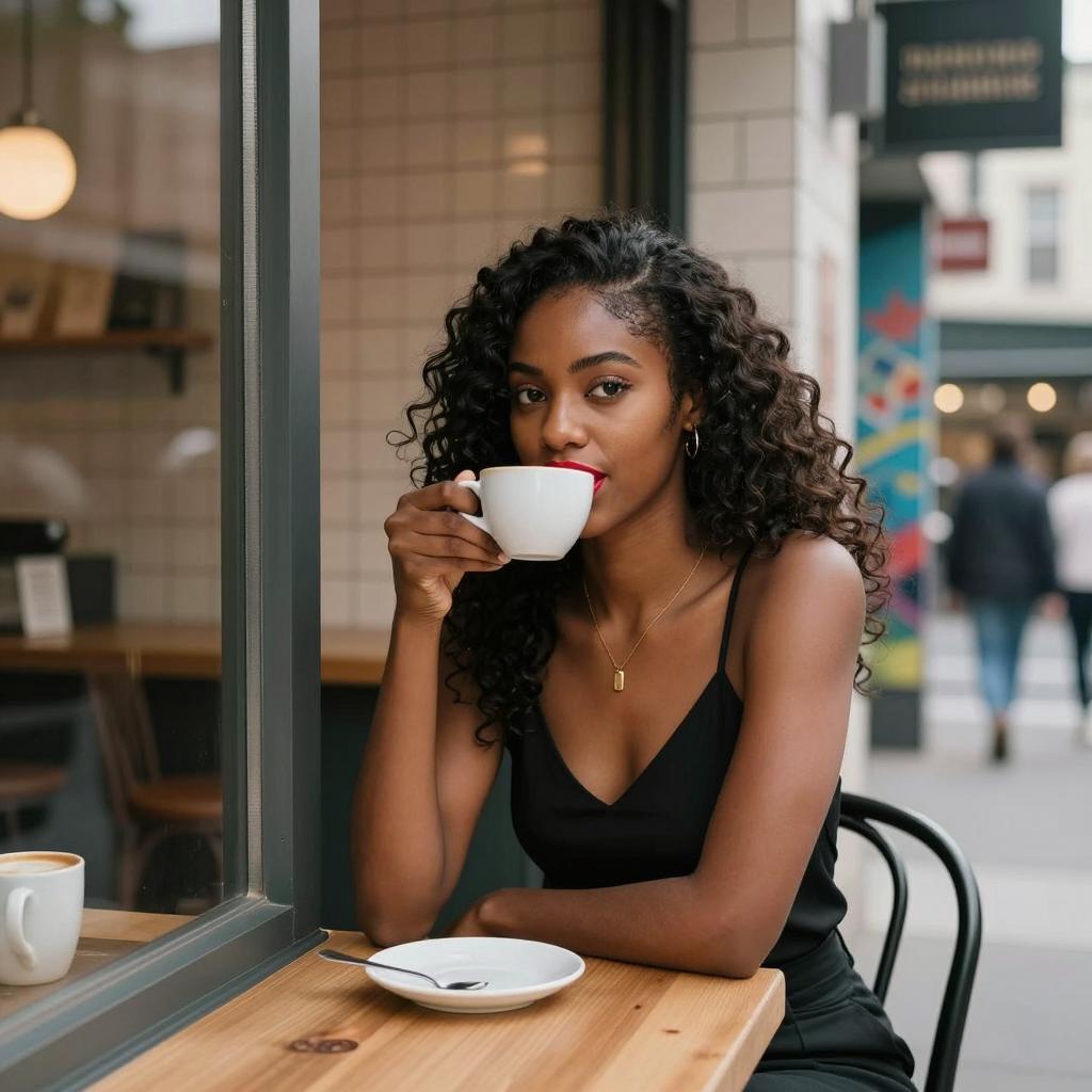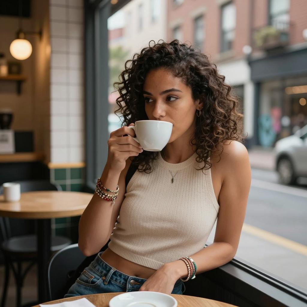 Woman drinking coffee at an open café window, casual street-view portrait, freckled woman with high ponytail and cheerful expression wearing white sleeveless top and dark high-waisted trousers posed leaning halfway through the open window, cup held in one hand in green courtyard café with plants spilling around the window, cinematic city atmosphere, high resolution, ultra-detailed