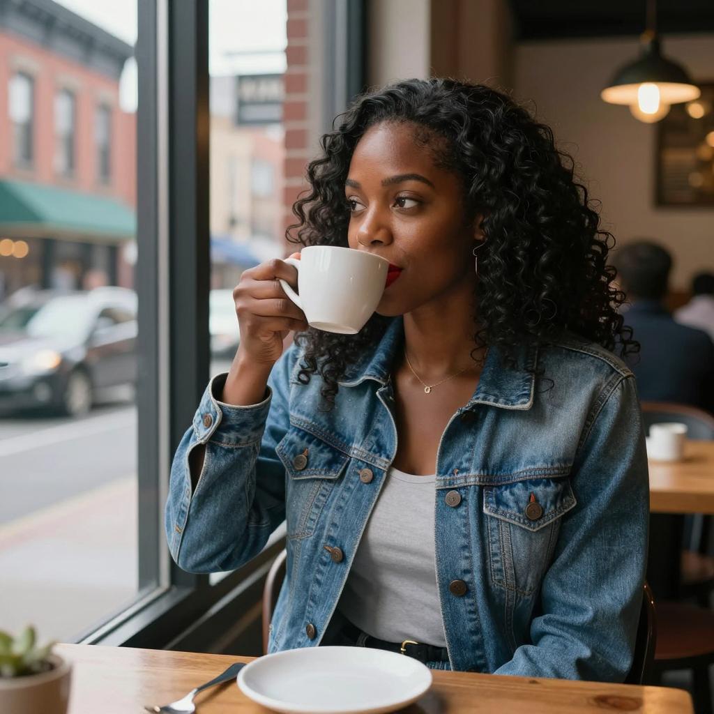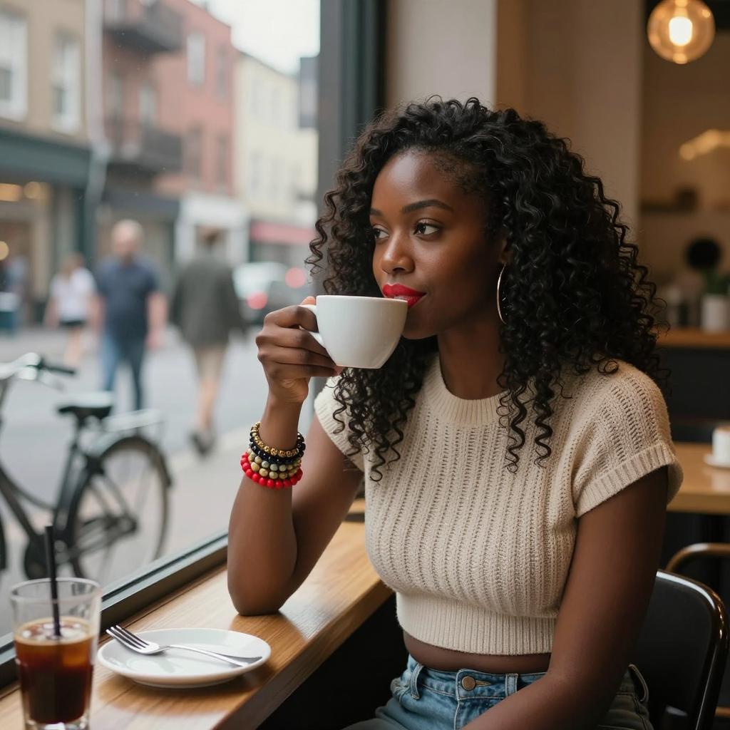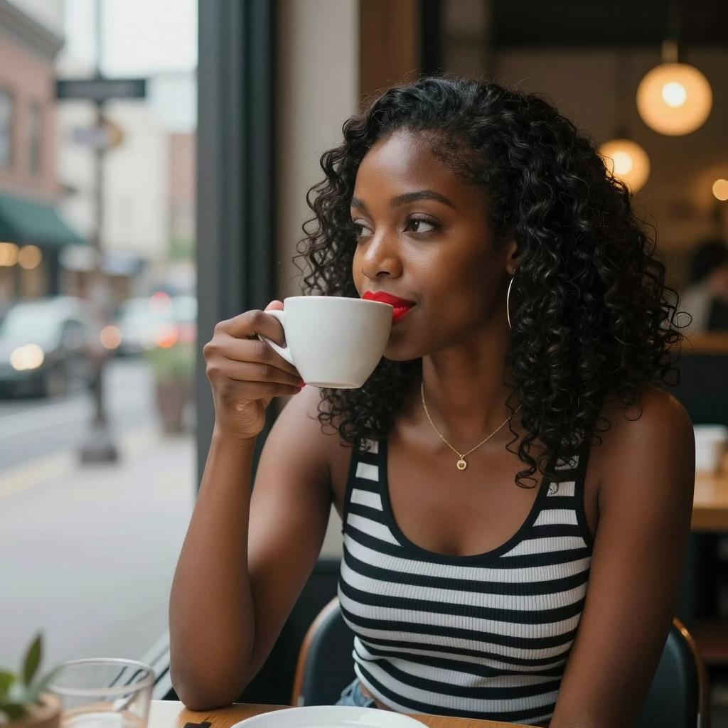 Woman drinking coffee at an open café window, casual street-view portrait, freckled woman with high ponytail and cheerful expression wearing white sleeveless top and dark high-waisted trousers posed leaning halfway through the open window, cup held in one hand in green courtyard café with plants spilling around the window, cinematic city atmosphere, high resolution, ultra-detailed