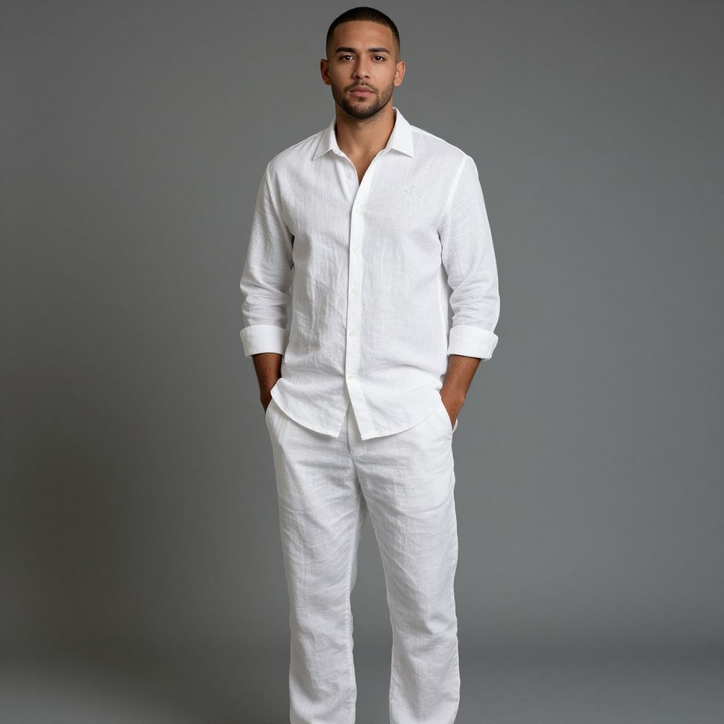 White linen outfit man, 1boy, male focus, solo, white pants, shirt, pants, flower, white shirt, looking at viewer, feet out of frame, hands in pockets, short hair, facial hair, collared shirt, standing
