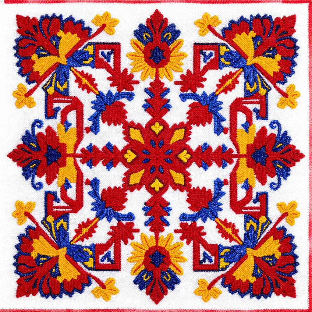 Serbische folk art inspired pattern, intricate geometric shapes and floral designs in bright reds, blues and yellows, traditional embroidery style, symmetrical composition, handcrafted elegance, stylized and colorful, cultural heritage motif