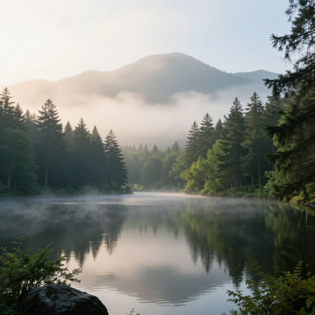 AI generate a photo of a serene mountain lake at sunrise, mist rising over the water, pine trees surrounding the lake, photorealistic with crisp reflections, soft warm light, peaceful and tranquil atmosphere, high detail