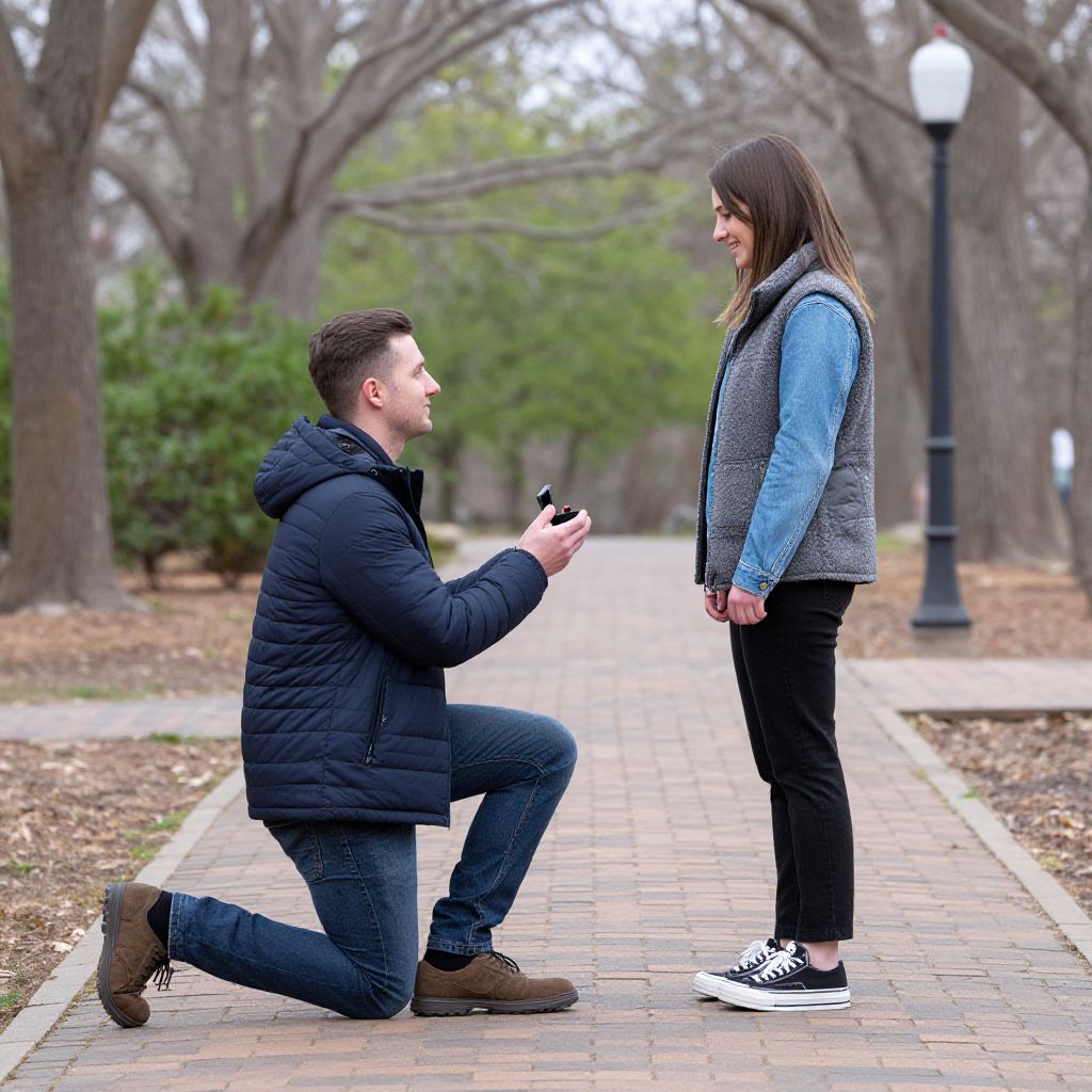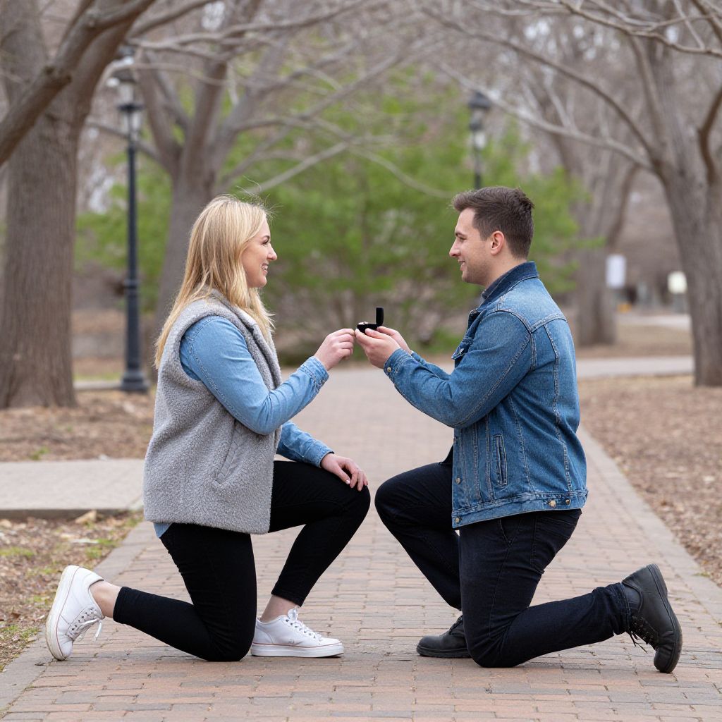 Man kneels on a brick pathway in a park, presenting a ring box to a smiling woman dressed in a denim jacket and gray vest, capturing a heartfelt proposal moment amidst bare trees and greenery.