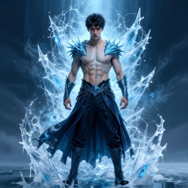 Powerful male figure stands proudly atop rugged snow-covered mountain peak, intense avalanche crashing down slope in background, ethereal light rays radiating from above, illuminating his determined expression, icy wind whipping through his hair, majestic landscape unfolding beneath him. Man has masculine face and piercing eyes