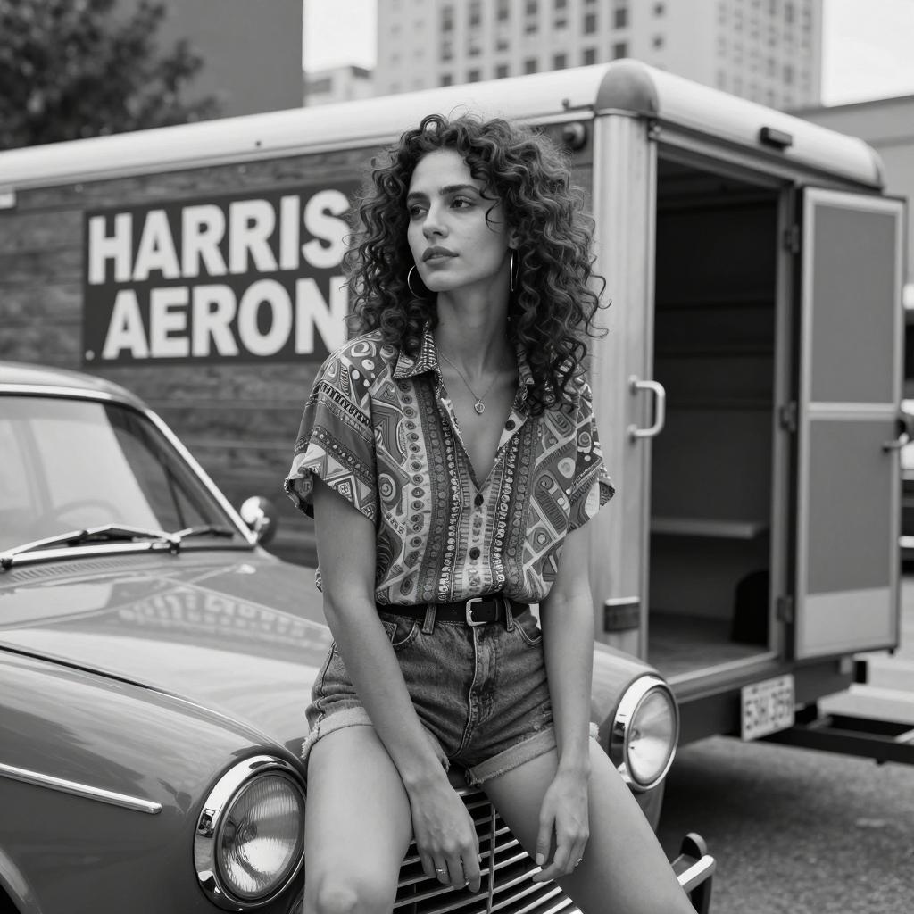 Black and white photograph. Woman with short, wavy hair, wearing a fur jacket and beaded necklace, stands next to a classic car. Neon sign with glowing letters in background. Trees and cars in dimly lit street. Woman's expression is slightly intense. Number of people: 1.